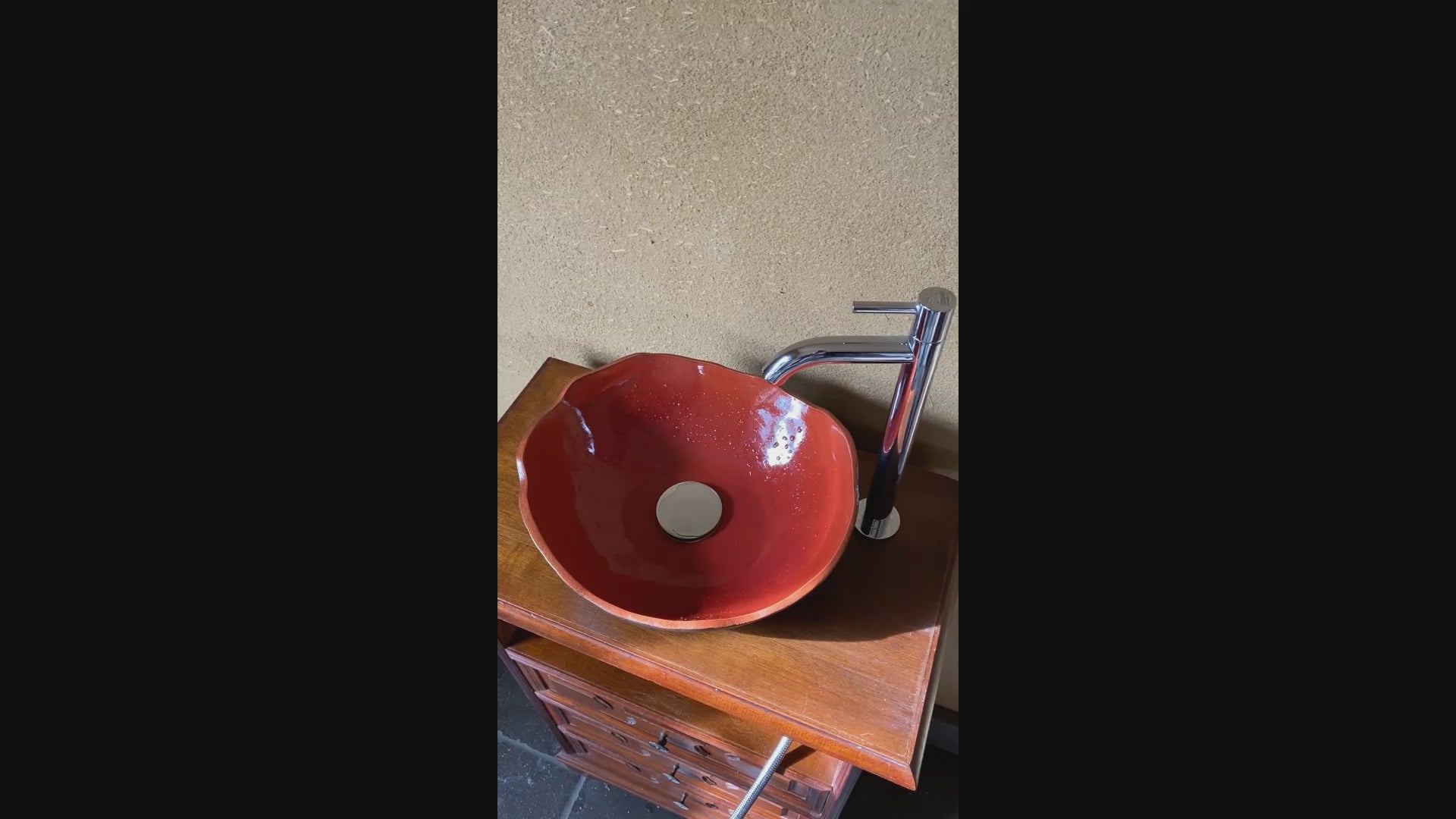 Vintage sanitair meubeltje met rode keramische spoelbak en een elegant kraantje