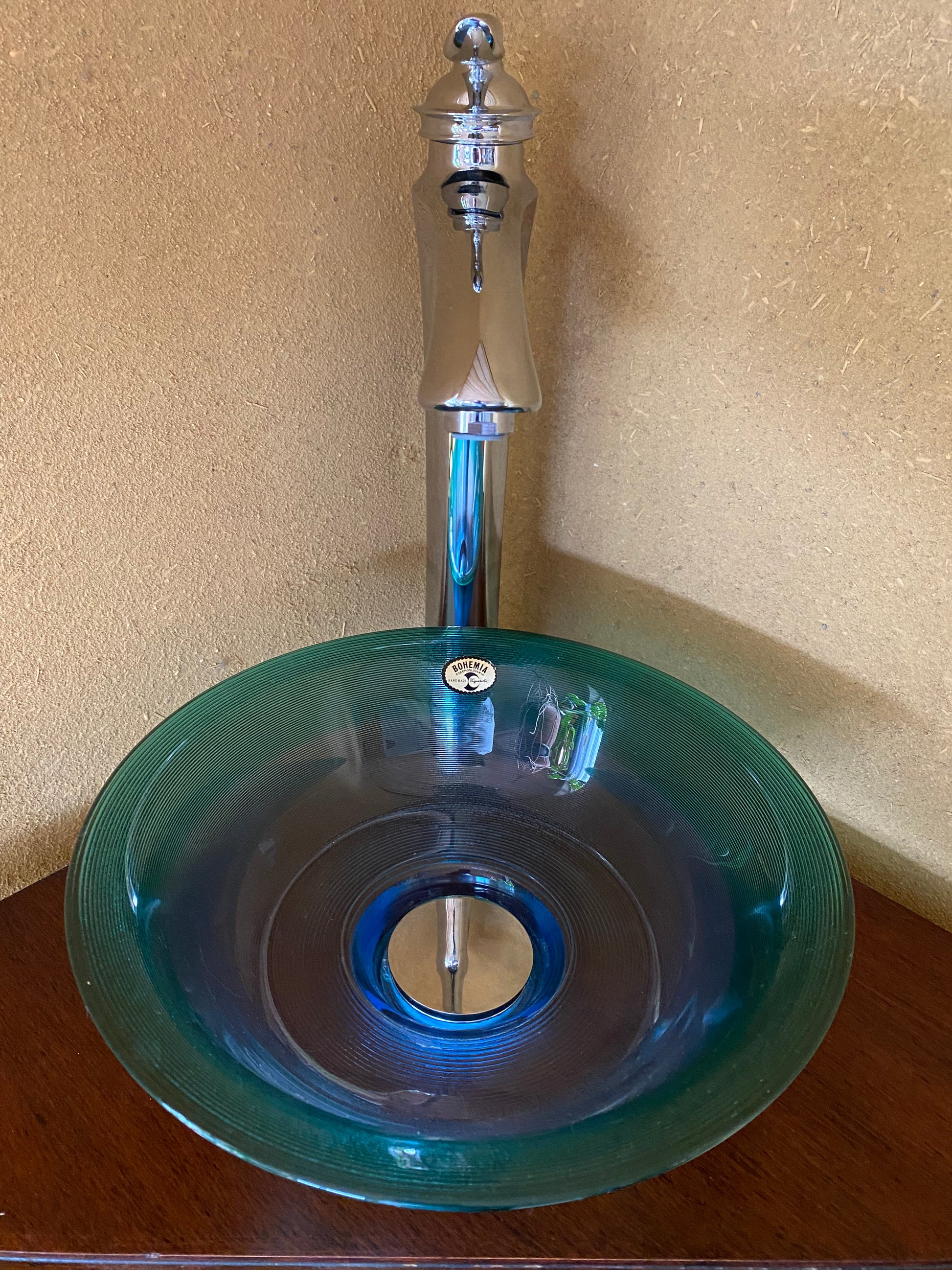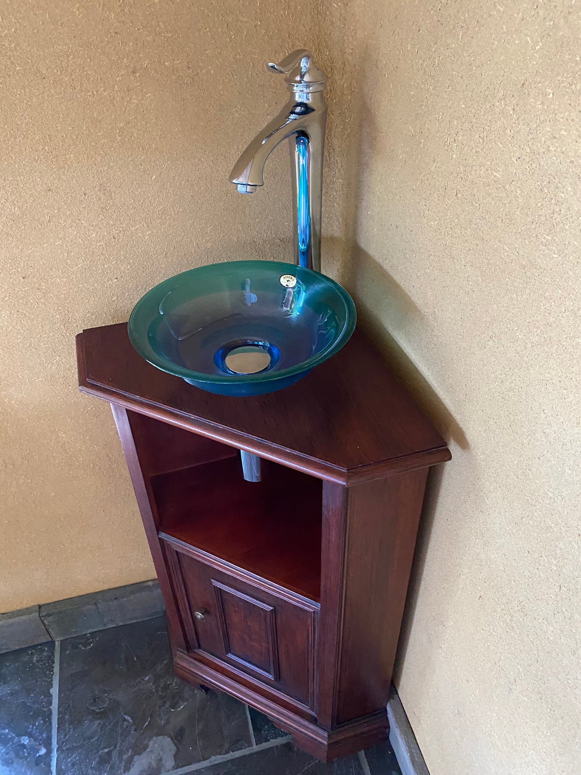 Ambachtelijk sanitair hoekmeubeltje met groen glazen wasbak en kwalitatieve kraan.
