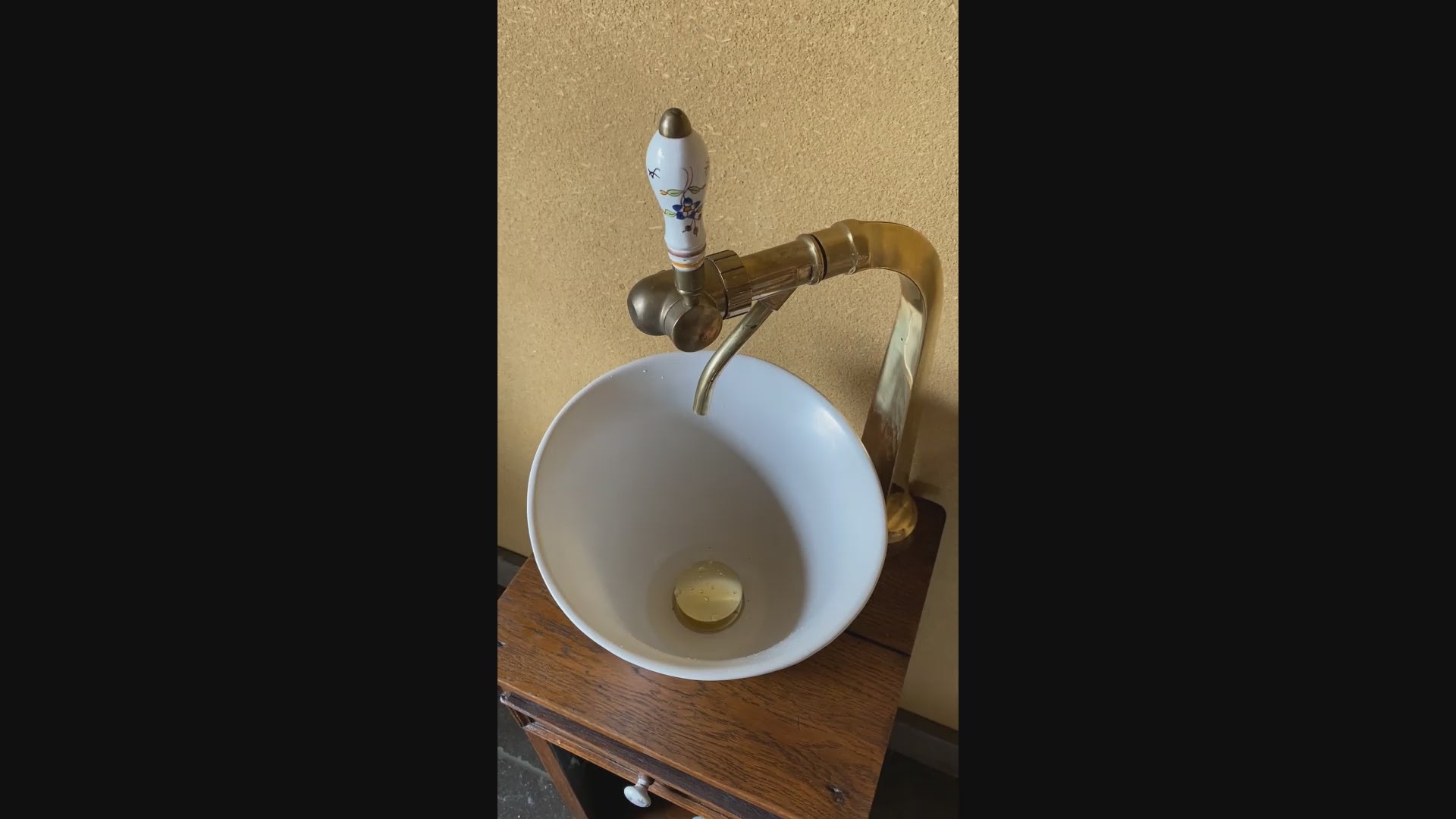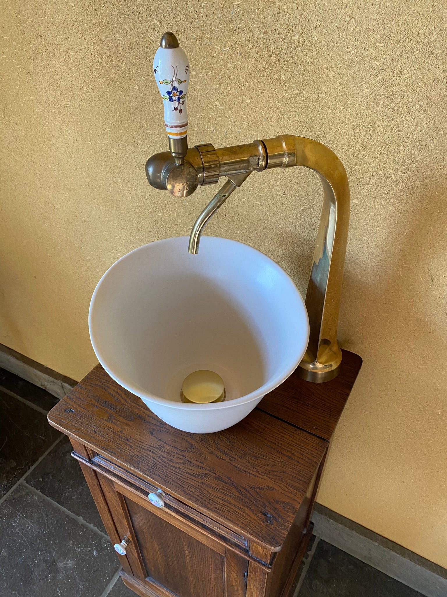 Vintage sanitair meubeltje met witte keramische spoelbak en een originele tapkraan