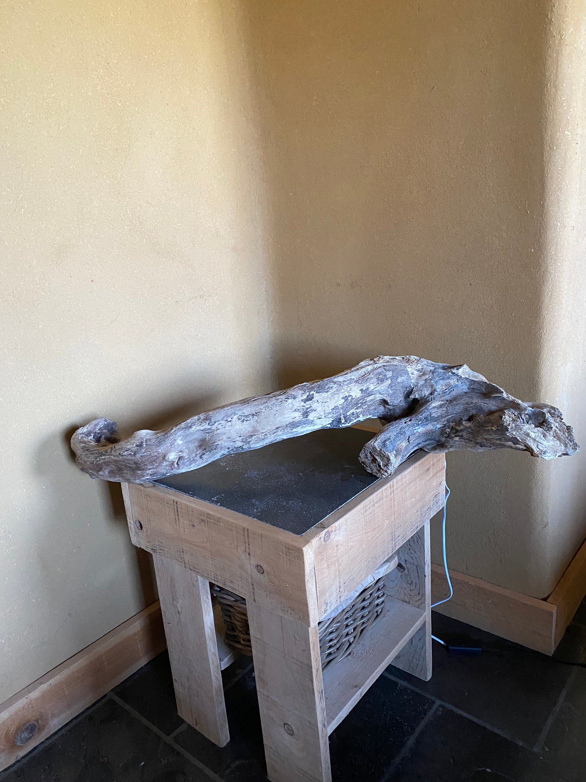 Dit mooi stuk drifthout is omgevormd tot een liggende lamp met indirect licht naar achter toe. Ze is 80 cm breed en heeft een ledstripje die dimbaar is.