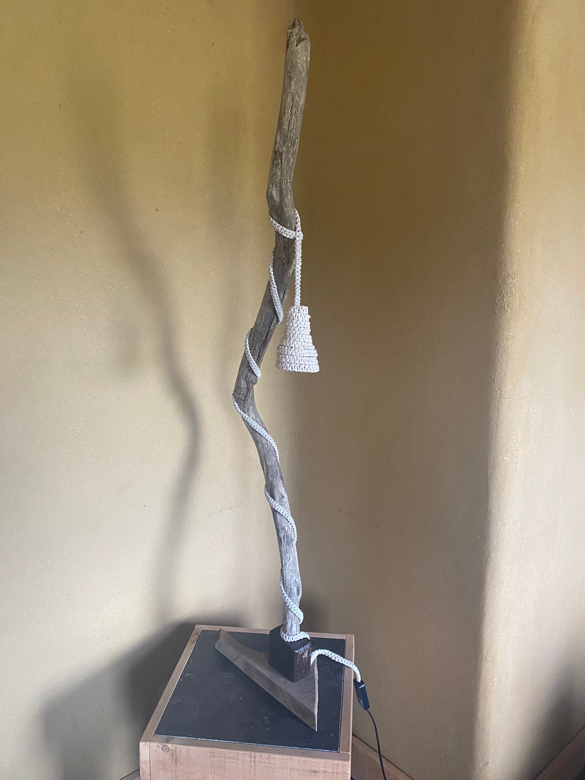 Deze unieke lamp is gemaakt uit drifthout, een onderdeel van een spoorweg, een eiken voet en een macramé lampenkapje.