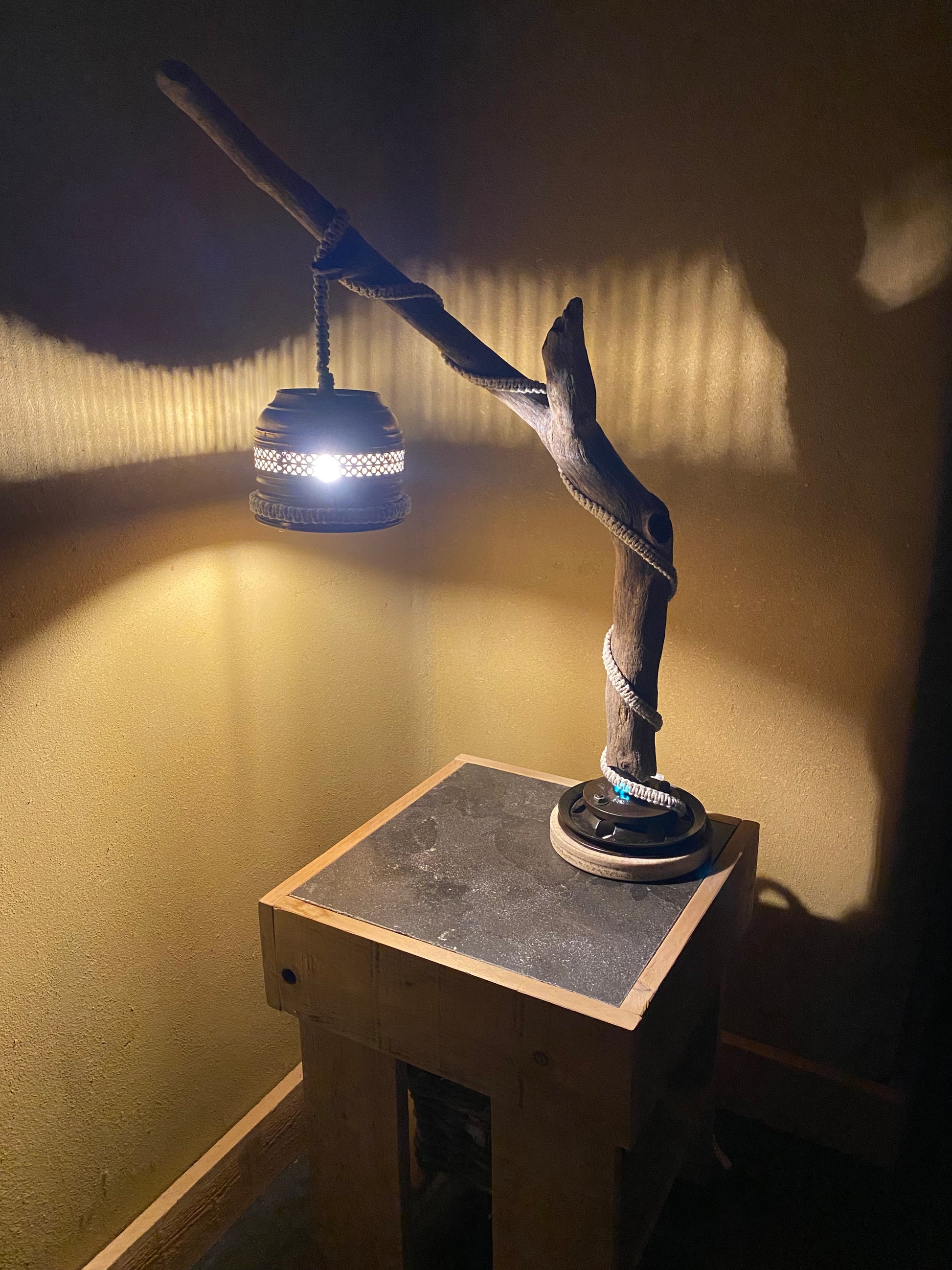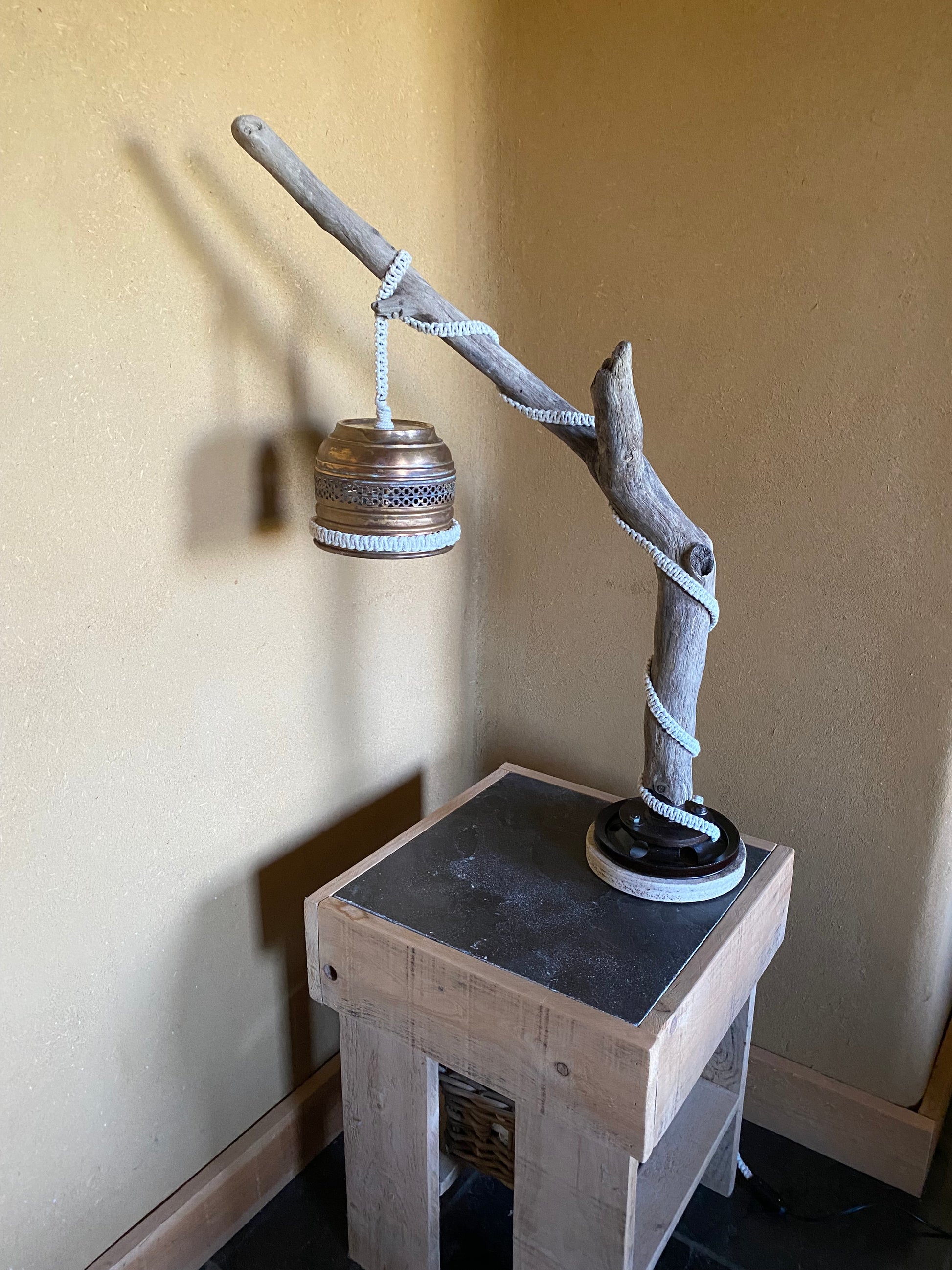 Deze unieke tafel/bureaulamp is gemaakt uit drifthout, een oude schijf en een lampenkap uit Spanje. Afgewerkt met macramé. Uitgerust met een snoerdimmer.
